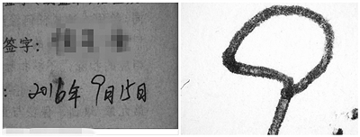 | “2016年9月15日”字迹中“6”字处有涂改迹象,且残留有“7”字笔墨痕迹;“9”字有另起笔,弧状笔画的“起笔”变成“收笔”压在竖笔之上。 |