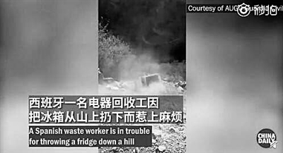 近日,一名西班牙电器回收工人拍摄了一则将冰箱扔下山的视频并上传网络,声称这就是他的“回收”方式。不料这则视频引起警方注意,警方向男子开出45000欧元(合人民币约35万元)的罚单,并要求他把冰箱从山崖下拖回山上,还拍摄拖回冰箱的过程上传网络以示警戒。