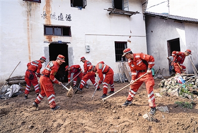 | 武警浙江总队机动支队官兵在新兴村清理淤泥 |