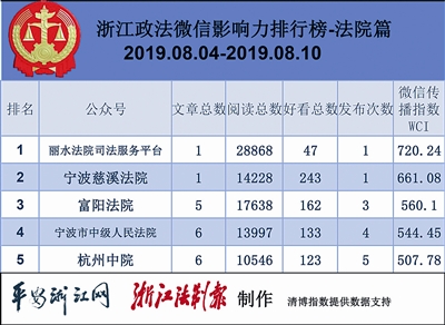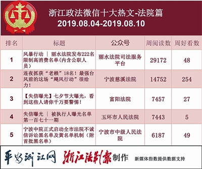 曝光被执行人决不手软。本期法院榜单,“丽水法院司法服务平台”夺得双桂冠。热文榜上,前三篇文章均事关被执行人,无论在浪漫七夕还是狂风暴雨,曝光被执行人从未松懈。