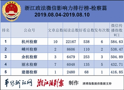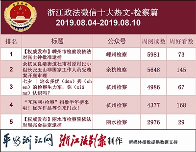 本期检察院榜单,前三依次是“杭州检察”“嵊州检察”“余杭检察”。热文榜上,“嵊州检察”《【权威发布】嵊州市检察院依法对张士钟批准逮捕》一文夺冠。往期榜单,“嵊州检察”鲜有进前五的,这次凭借热文挤进前三。看来,惩贪拍蝇,人人关注。