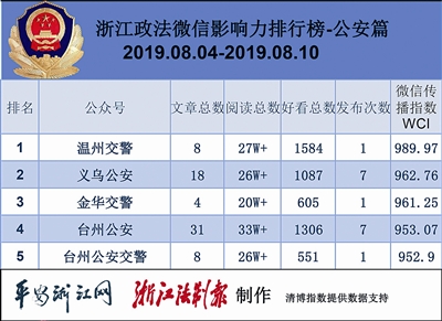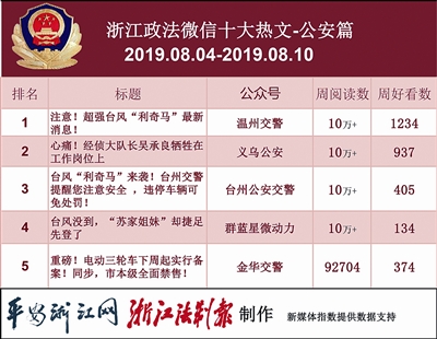 本期公安榜单,位列前三的依次为“温州交警”“义乌公安”“金华交警”。来自“温州交警”的《注意!超强台风“利奇马”最新消息!》一文获得10万+阅读量,1234个在看数,夺得热文榜单第一。值得一提的是,本期共4篇10万+美文,都来自公安系统,其中有3篇与“利奇马”相关。