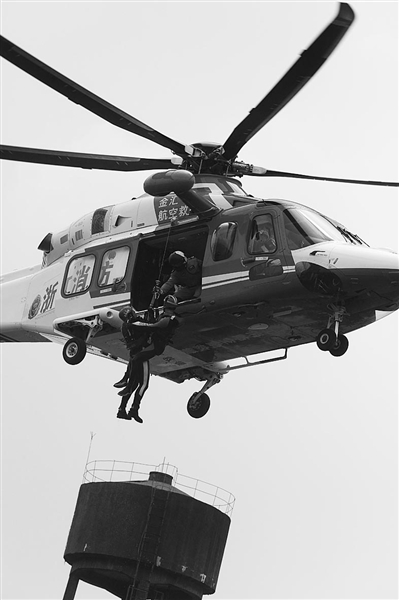 几分钟后,一架直升机出现在演练水域上空。直升机上的消防员通过索降的方式靠近落水人员,很快将其救起,然后将被救人员快速护送到指定区域。
