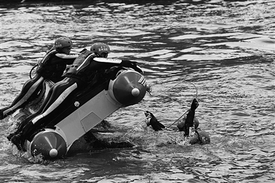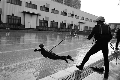 随着指挥员的一声令下,潜水救援科目和水域救援科目先后进行。只见2名全副武装的潜水消防员依次入水,开始用专业潜水打捞设备,进行对包括人员、车辆等目标的水下潜水监督、作业、信号绳索操作等内容的演示。同时,担任水域救援任务的消防员在目标水域,驾驶冲锋舟进行落水人员救援等水域救援演示。