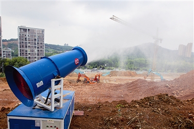 8月20日,长兴诺亚舟美顿幼儿园项目现场,多台大型雾炮机、喷淋设备、高层塔吊喷淋设备开启使用中,扬尘在线监控系统24小时检测,有效缓解工地扬尘的扩散。