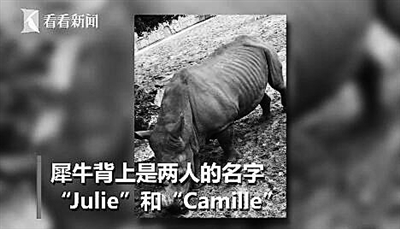 引发众怒! 法国游客在犀牛背上刻字