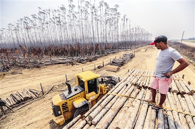 8月25日,在位于巴西乌迈塔的亚马孙雨林,一名男子望向被火灾破坏的桉树林。