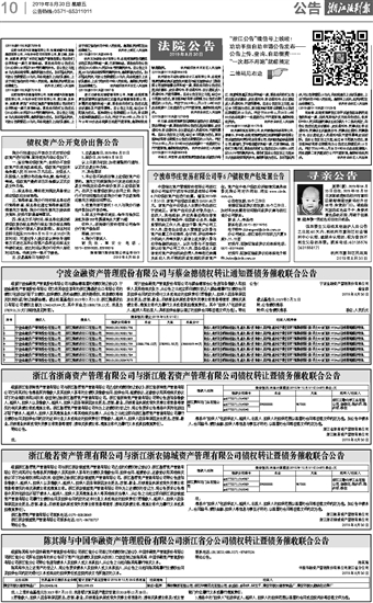 陈其海与中国华融资产管理股份有限公司浙江省分公司债权转让暨债务催收联合公告