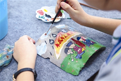 直播开始后,我们的镜头在学校的展览室里找到了答案。只见,同学们用手中的画笔在瓦片、蚌壳上描绘出自己心目中的宪法世界:是鲜红的宪法读本,彰显着至高无上的法律权威;是老百姓手中的宪法读本,维护着社会公平正义;是中小学生头顶的“保护伞”,守护着未成年人健康成长……