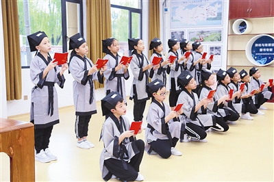 “幼学法、树德行,人有德、水至清……”告别了模拟法庭,一阵朗朗读书声传入我们的直播镜头。在学校的报告厅里,一群穿着汉服的学生们正摇头晃脑地诵读《宪法三字经》。