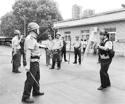 为强化学校安全防范措施,切实维护校园安全稳定,昨天上午,天台县公安局巡特警大队走进天台中学开展应急处置演练。特警向学校安保人员传授防暴恐等突发事件处置知识技能,指导使用防暴叉、警棍等防暴器械要领,示范擒敌战术,有力有效地提升校园安保人员业务技能。通讯员 许尚高 明才