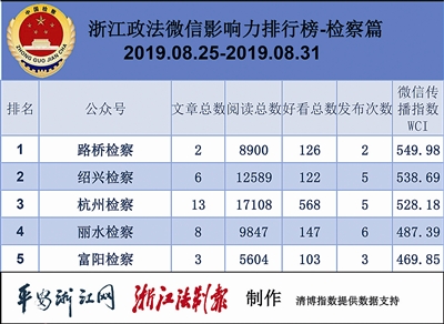 本期检察榜单的排名“大换血”,“路桥检察”“绍兴检察”“杭州检察”位列前三。热文榜中,“绍兴检察”和“衢州检察”的两篇热文都与招聘司法雇员有关。想要捍卫正义、拥有法治梦想的你,不妨去看看吧。