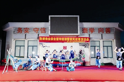 白底红墙、彩旗飘扬,高亭镇枫树社区文化礼堂枫村文化礼堂内,拥有浓郁的渔村文化、红色氛围。台上,“瀛洲红帆”宣讲队正在就安全生产知识向现场观众进行讲解,其中还穿插着戏剧、小品等表演,以通俗易懂、喜闻乐见的的演出方式,为渔村村民带来了身边的“平安课”。