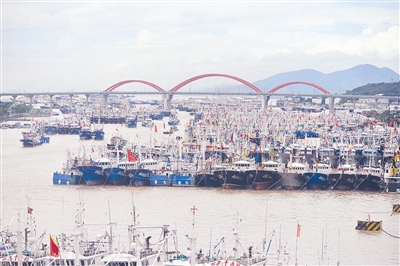 9月5日上午,舟山市出海生产的3000多艘渔船纷纷从东海渔场返回沈家门渔港,卸载海鲜,躲避台风“玲玲”。胡社友 摄