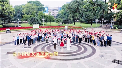 通过无人机鸟瞰的视角可以看到,越来越多的市民围聚过来,恩波公园的中心广场成了一片红色的“旗海”。“五星红旗迎风飘扬,胜利歌声多么响亮……”随着歌声的响起,一袭红裙的小女孩、穿着白衬衫的男主唱、长礼服加身的女主唱慢慢走进画面里,在现场的市民被气氛感染,也跟着高歌。为了礼赞中华人民共和国成立70周年,这次的演唱曲目《歌唱祖国》中还创造性地融入了具有宪法元素的说唱,将“宣传宪法”和“歌颂祖国”两个主题合二为一,相得益彰。