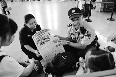 连日来,台州铁路派出所三门县火车站警务站民警向出行旅客开展爱路、护路宣传和防诈骗宣传,深受旅客好评。图为9月13日,民警在候车大厅向旅客开展铁路安全宣传。