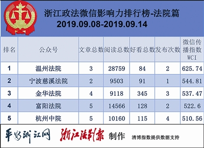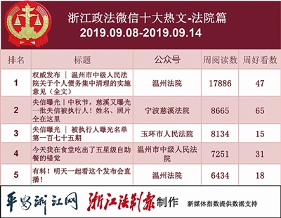 本期法院榜,“温州法院”获得影响力榜和热文榜的“双料冠军”,该公众号热文《权威发布 | 温州市中级人民法院关于个人债务集中清理的实施意见(全文)》收获阅读数遥遥领先。据悉,温州市中院通过建立个人债务集中清理机制,给“诚信而不幸”的被执行人以重生机会,进一步完善了执行不能案件有序退出机制。