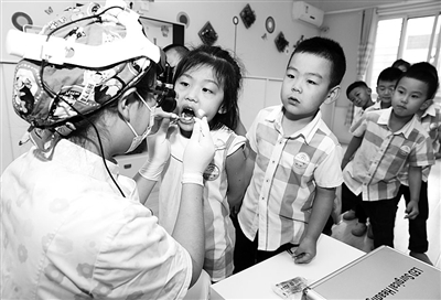 9月19日,医护人员在石家庄市第一幼儿园为小朋友检查口腔。
