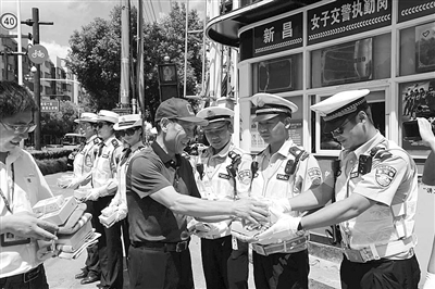 入夏以来,山城新昌持续高温,当地交警顶着烈日,坚守岗位,指挥疏导交通,全力确保道路畅通有序和谐。和往年一样,近日,一个熟悉的面孔又出现在当地正在值勤的交警面前,新昌县政协常委、国贸实业有限公司董事长潘若平走上街头,慰问高温下坚守岗位的交警。据了解,国贸实业有限公司是新昌当地知名的大型商贸企业,今年已是该企业连续第19个年头慰问交警。