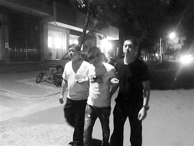 昨日凌晨时分,临海杜桥派出所巡特警中队民警在大庆安保武装设卡时,查获涉嫌故意伤害的网上在逃人员徐某并当场抓牢。图为徐某(中)被带回派出所。