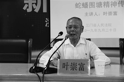 | 九旬老人来讲党课 日前,三门县法院邀请95岁老党员叶崇福来讲党课。老人以“永远的丰碑——蛇蟠围塘精神传承”为题,为法院干警带来一堂生动的“初心”党课。 通讯员 叶晨霞 毛林飞 摄 |