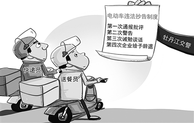近日,黑龙江省牡丹江市公安局交警支队在全市快递和送餐企业实施交通违法抄告制度。快递员、送餐员发生闯红灯、逆行等违法行为的,交警部门将抄告给所属企业。新华社 王鹏 作