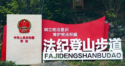 法纪登山步道共设有4对法纪门廊、14个普法宣传栏、1个法纪故事小景和6个屏风式宣传栏。步道入口便是庄严醒目的《中华人民共和国宪法》雕塑,拾级而上道路两旁、林荫之中不仅有法制史进程的介绍,还有处处可见的法纪标语、法治故事长廊等,让游客在健身的同时接受法律的熏陶。