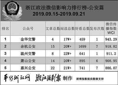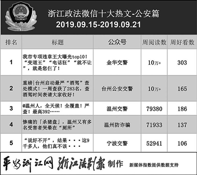 恭喜“金华交警”“余杭公安”“温州交警”,分别拿下前三名。热文榜中,有两篇热文阅读数都超过10w+,分别是“金华交警”的《我市专项违章王大曝光top10!“变道王”“电话狂”“就不让”,就是您仨了!》、“台州公安交警”的《重磅|台州启动最严“酒驾”查处模式!一周查获了283名,查酒驾时间表请大家收好!》。