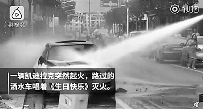 最硬核“吹蜡烛”! 轿车自燃,过路洒水车播生日快乐歌灭火