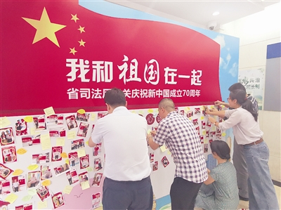 这几天,省政府10号楼成了很多党员干部的“打卡新地标”。原来,为庆祝新中国成立70周年,省司法厅直属机关党委在这里举办了一场“我和祖国在一起”主题活动,通过“我与国旗合影”“我对祖国说句话”等形式,为祖国母亲送上美好祝福。
