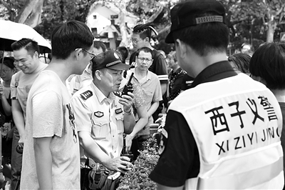 其实,最让陈宗耀提心吊胆的还是一些心大的父母。就在前几天,一名河南女子报警称自己的两个孩子找不到了。接到警情后,陈宗耀立即在微信工作群里发动人力寻找,加上查看监控,不到20分钟就将两个小孩找了回来。可等小孩找到时,小孩的妈妈又不知所踪了,无奈之下,陈宗耀只好再次发动力量将妈妈找了回来。“像这样小孩走失的事情,每天至少发生10起。”因此,每每看到忽略了小孩、只顾自己拍照游玩的家长,陈宗耀都会上前一脸严肃地“教育一顿”。