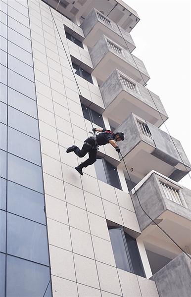 “快走,爸爸要出来了!”人群突然朝着另一边涌去,特警队员开始了模拟演练。400米障碍跑,特警们矫捷的身姿迎来了一波又一波的尖叫。“爸爸!爸爸飞下来啦!”小女孩一边兴奋地跺着脚,一边扯着嗓子喊叫着正在进行速降演练的爸爸。只见一名特警队员从下面爬上速降台,再从上面滑下来,前后不过1分钟,这还是他第一次在女儿面前展现自己英武的模样。降下来后,他回头对小女孩笑笑,用力地挥了挥手。