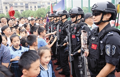 在枪支展示区,几个小男孩拿着枪爱不释手。“以后想不想当警察?”特警队员一边介绍着不同枪支的用途,一边拍拍男孩子的肩问道。“想!”男孩们声音嘹亮。