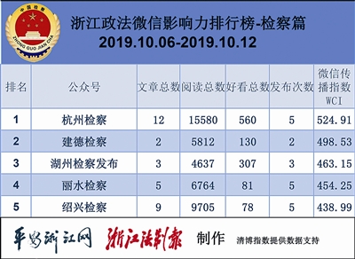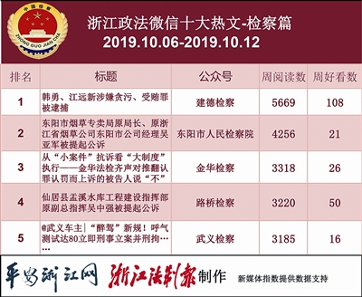 本期检察榜单,“杭州检察”位列第一。而在热文榜中,“建德检察”的《韩勇、江远新涉嫌贪污、受贿罪被逮捕》一文获得了最多关注,“拍蝇打虎”,一起共建清廉浙江。