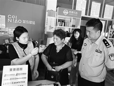 日前,临海市公安局大田派出所将“人脸识别”系统推广到辖区各个快递点,以保障寄递安全。目前,已有7个快递门店应用了该系统。图为民警到快递门店检查“人脸识别”应用情况。通讯员 金健
