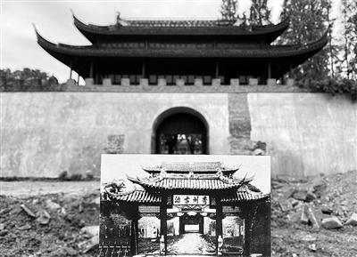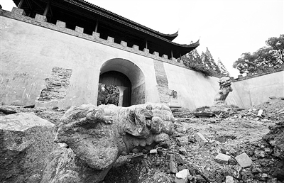 听闻子城遗址公园改造工程现场发现了一只母石狮子,《嘉兴近现代丛书》主编、上海师范大学历史系副教授岳钦韬也来到现场一探究竟。翻开特意带来的由嘉兴市图书馆编著的《稀见嘉兴抗战旧影集》,岳钦韬指着其中一张照片说,子城谯楼前至少有过2对4只石狮子,一对在谯楼下、城门的东西两侧,另一对在原有牌坊的东西两侧。“这是1938年的照片,显示城门西边和牌坊西边的2只石狮子都已倒在地上,也就是说,在那时候,这次发掘出来的石狮子就已经倒了。”至于是何时被掩埋于地下的,就需要历史与考古等各方面共同来发掘更多故事。