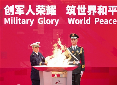 10月16日,国际军事体育理事会主席赫尔维·皮奇里洛(左)点燃第一支火炬。