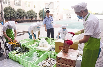 6时30分,配送车准时到达食堂。在民警确认各配菜中没有夹带违禁品后,叶喜明和同伴们对所有菜品的质量、重量进行了复验。“肉沫新鲜的!”叶喜明熟练地撕开装着肉沫的塑料袋,用手指轻轻一刮,鼻子凑上去闻了闻。同伴们也分工检查蔬菜是否有腐烂、腊肠是否在保质期内等问题。