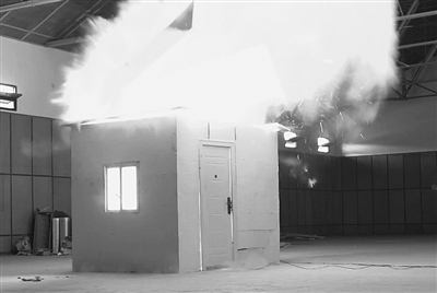 2分43秒,经仪器测量显示,厨房内烷类混合气体数据达到峰值,工作人员开始远程点火。