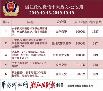 恭喜!本期公安榜单,“金华交警”又夺第一。其《女子被货车拖行40米事故最新进展:事故认定出炉,伤者拒绝签字》一文以10万+的阅读量、1587个在看数稳居榜首。该文讲述金华一女子因逆行、闯红灯而被大货车拖行,交警依法判其负全责的事情,一经发布便引起广泛关注。网友留言表示:公平正义,无可争议,为交警点赞。