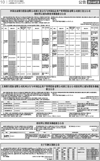 中国农业银行股份有限公司浙江省分行与中国信达资产管理股份有限公司浙江省分公司 债权转让通知暨债务催收联合公告