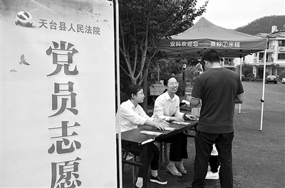 近日,天台县法院组织党员志愿者来到始丰街道安科村,通过发放宣传资料、开展法律咨询活动等方式进行普法宣传。
