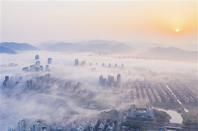 10月29日,余姚市出现平流雾景观,建筑、道路、河流等在雾中若隐若现,宛若仙境(无人机拍摄)。通讯员 张辉 摄
