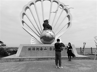 在直播镜头中,大型法治主题雕塑——“海上明珠 善润南麂”给予观众较强的视觉冲击,雕塑以扇贝形体为元素,展现南麂岛海洋风情以及“贝藻王国”的区域特色。