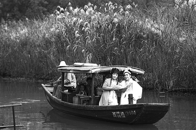 11月3日,在西溪湿地,游客在摇橹船上一边欣赏越剧吟唱一边欣赏芦花。正值深秋,杭州西溪湿地国家公园进入赏芦佳季。黄宗治 摄