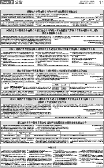 中国长城资产管理股份有限公司浙江省分公司对杭州金云装饰工程有限公司债权处置公告