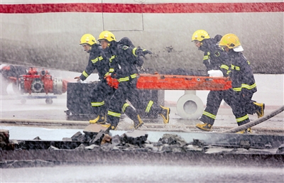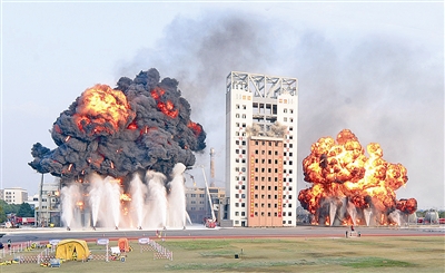 在灭火救援实战演习中,现场模拟某精细化工园区发生连锁火灾爆炸事故。全体参演消防指战员按照现场指挥部统一部署,在公安、电力、燃气、供水、环保、医疗救护、应急通信等应急联动力量的协助下,合理调度力量、快速应急响应,科学高效、规范有序地完成了灭火救援实战演习。