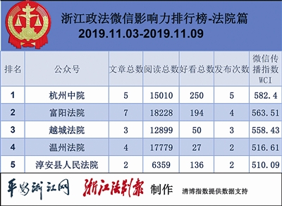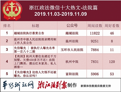 本期法院榜单,前三名依次为“杭州中院”“富阳法院”“越城法院”。热文榜依旧是失信被执行人的主场,其中,“越城法院”的《越城法院执行悬赏公告》摘得热文榜第一,营造诚信社会,需要大家共同参与。