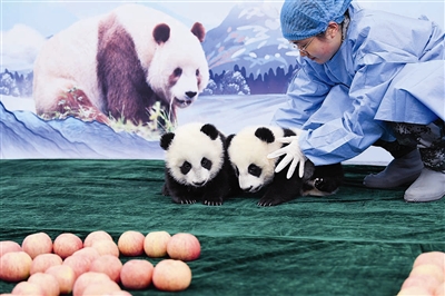 11月11日,秦岭大熊猫龙凤胎“佳佳”“园园”在陕西省林业科学院秦岭大熊猫繁育研究中心亮相。