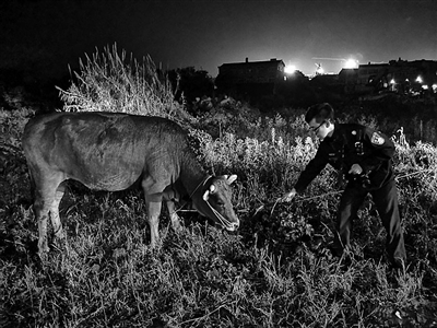 近日,天台县公安局坦头派出所接到群众报警,称村庄附近有头牛在路上乱窜,担心发生安全事故。民警迅速赶到现场,发现牛是因为牛绳脱落才跑出来的。时值凌晨,民警一时无法联系上牛主人,便用稻草将牛从公路上诱导至附近田野并拴住。早上6点,牛主人从民警发至村中微信群的消息里得知牛跑了,便赶来认领,最终将牛安全领回了家。通讯员 许尚高